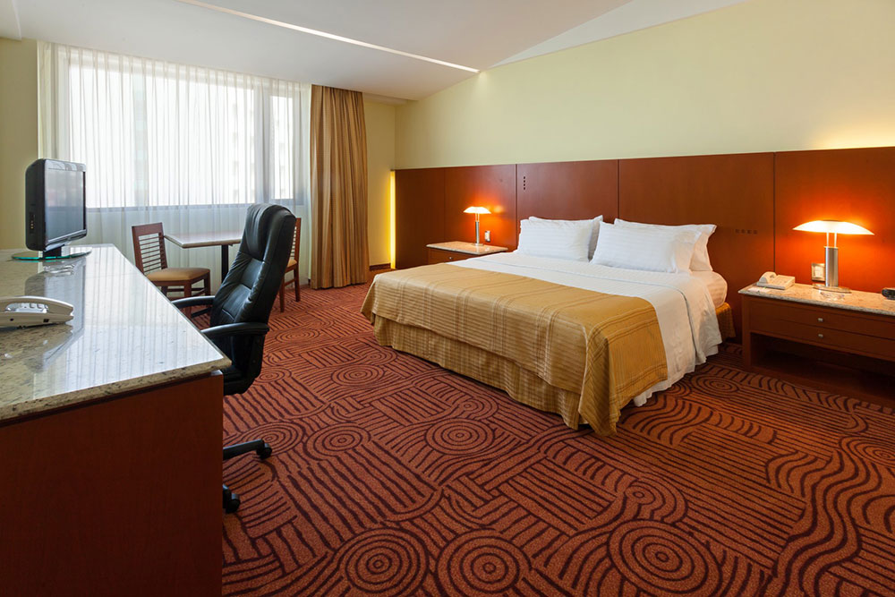 La habitación más amplia de la Ciudad con altos estándares de seguridad y el internet más veloz. Disfrute de la comodidad de una cama King Size nuestras almohadas suaves o firmes y el equipamiento como televisión plana con canales por cable caja de seguridad digital, radio reloj despertador, escritorio de trabajo y silla ergonómica.
